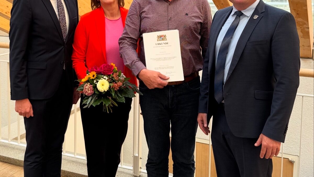 Für über 18 Jahre ehrenamtliches Engagement im Gemeinderat hat Harry Ebner eine besondere Anerkennung erhalten. Im Landratsamt Schweinfurt hat Landrat Florian Töpper ihm die Ehrenurkunde des Bayerischen Innenministers Joachim Herrmann überreicht. Gemeinsam mit seiner Ehefrau Heike Ebner und Bürgermeister Christian Keller hat Harry Ebner die Feierstunde erlebt.