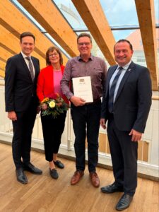 Für über 18 Jahre ehrenamtliches Engagement im Gemeinderat hat Harry Ebner eine besondere Anerkennung erhalten. Im Landratsamt Schweinfurt hat Landrat Florian Töpper ihm die Ehrenurkunde des Bayerischen Innenministers Joachim Herrmann überreicht. Gemeinsam mit seiner Ehefrau Heike Ebner und Bürgermeister Christian Keller hat Harry Ebner die Feierstunde erlebt.