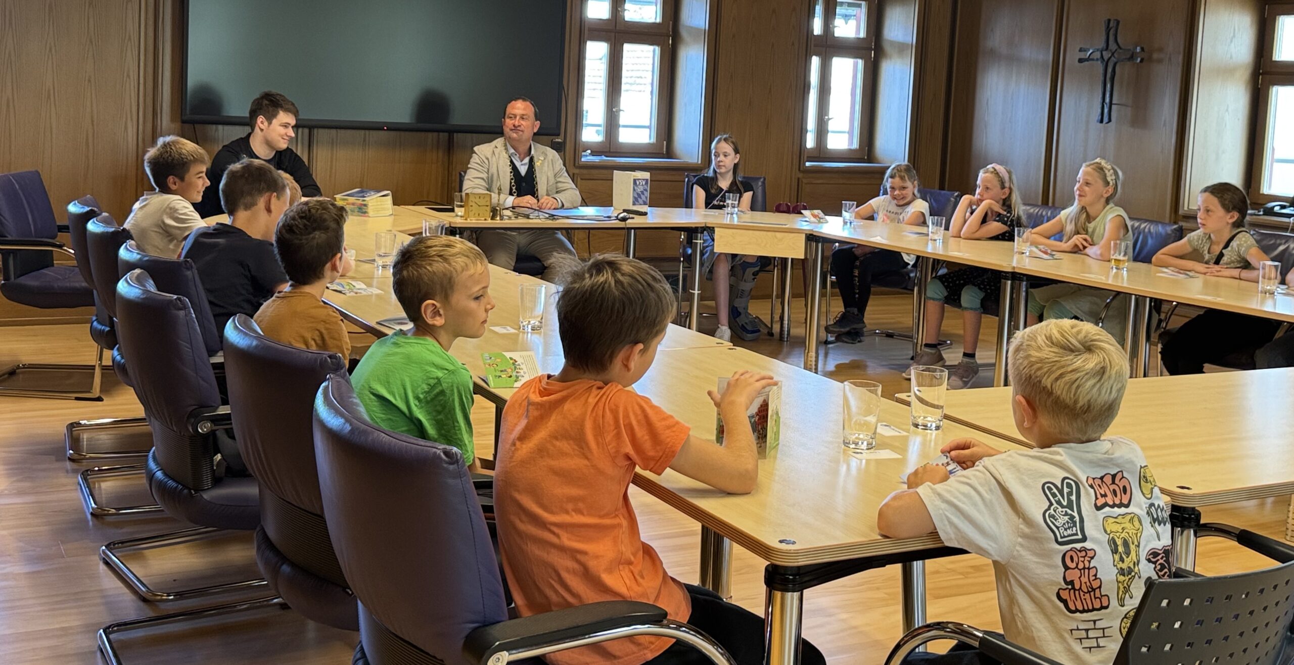 Anschließend haben wir gemeinsam das ganze Rathaus erkundet. Von Abteilung zu Abteilung, überall haben die Kinder hineingeschaut und viele Eindrücke gesammelt. Die langen Reihen von Aktenordnern, die verschiebbaren Archivschränke und die große Sammlung von Schlüsseln haben sie besonders beeindruckt. Für einen echten Höhepunkt hat der Zufall gesorgt: Genau in dem Moment, als wir im Bürgerbüro waren, hat der Gemeinderat und unser Seniorenbeauftragter Mathias Kupczyk seinen neuen Ausweis beantragt. Die Kinder konnten dabei zuschauen, wie das Foto gemacht, Fingerabdrücke genommen und der Ausweis bestellt wurde – ein Erlebnis.