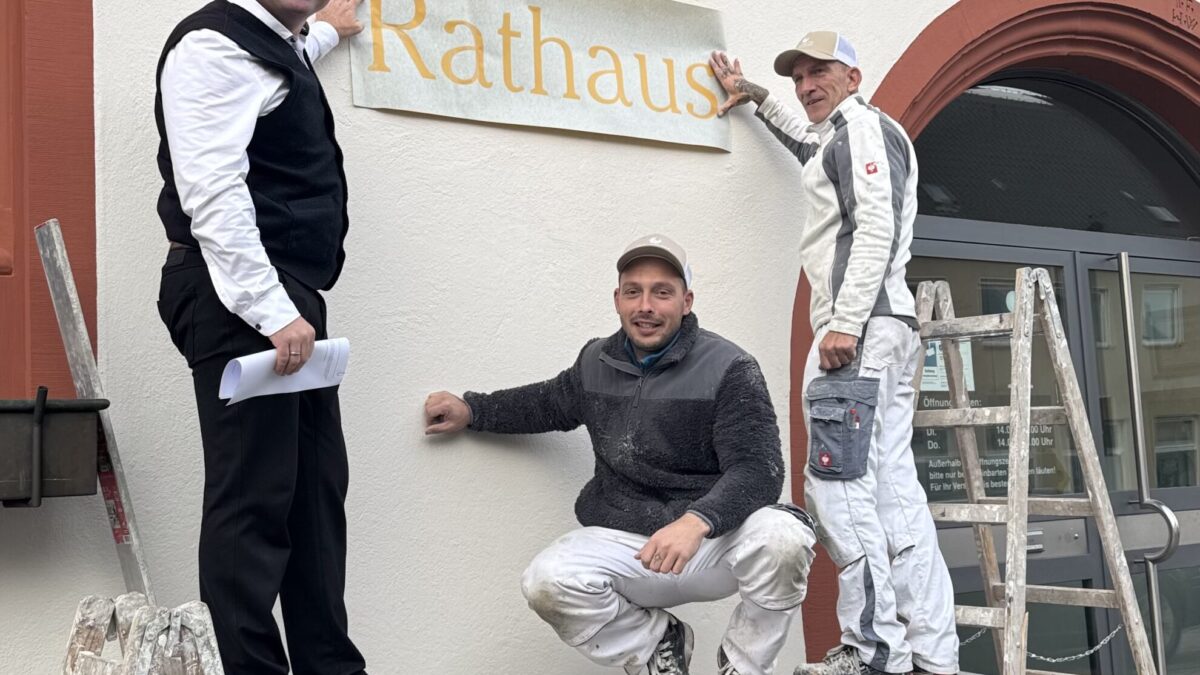 Mit der Beschriftung präsentiert sich das Rathaus dann wieder vollständig und in einem würdigen Erscheinungsbild, passend zu seiner Bedeutung als zentrales Bauwerk der Gemeinde.