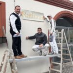 Für die abschließende Arbeit ist Sascha Barth, Inhaber der Maler- und Verputzerfirma Barth aus Röthlein nach Grafenrheinfeld gekommen. Mit einer präzise angefertigten Schablone hat er die neue Beschriftung an der frisch sanierten Fassade angebracht.