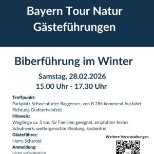Der Biber und seine Fraßspuren und Burgen. Erfahren Sie viel Wissenswertes über die scheuen Tiere und deren Lebensgewohnheiten. Führung für Familien geeignet, ca. 5 km Weglänge, […]
